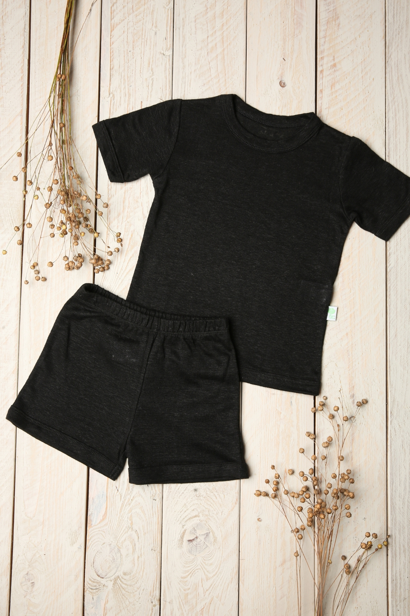 Komplektą sudaro marškinėliai trumpomis rankovėmis ir šortukai. Toks kirpimas suteikia daugiau laisvės judėti, todėl vaikiška pižama su šortukais patinka vaikams, kurie miegodami vartosi, keičia pozas ar nenori „apsunkinto“ jausmo ant kūno. Linas yra natūralus pluoštas, todėl jis malonus prie odos ir tinka jautresniems vaikams, kai norisi paprasto, švelnaus prisilietimo be dirginimo.
